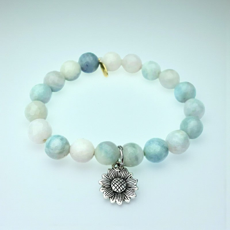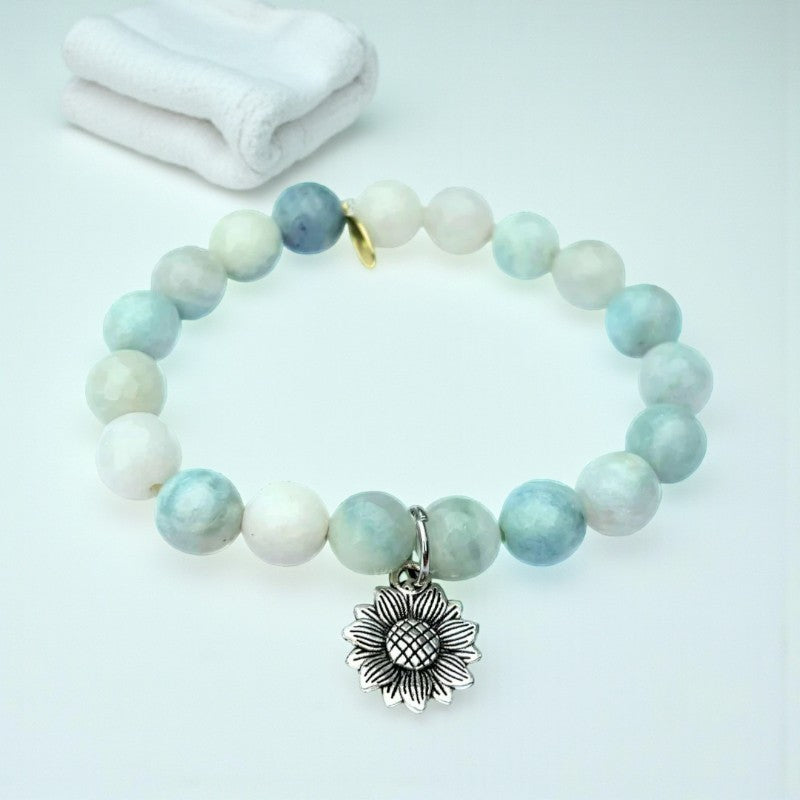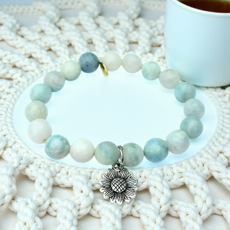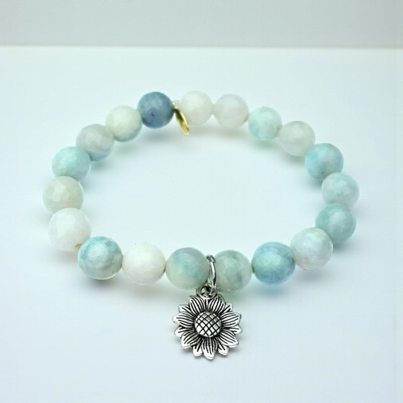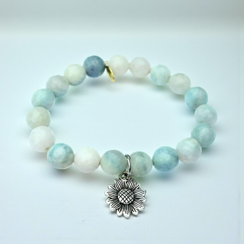 Embrace the calming and protective energies of the Faceted Aquamarine bracelet, adorned with a silver sunflower charm. Let the tranquil vibrations of Aquamarine guide you towards inner peace, courage, and emotional clarity. Wear this bracelet as a symbol of strength and protection, allowing its energies to support your journey towards holistic well-being and spiritual enlightenment. Whether seeking balance, courage, or spiritual cleansing, let Aquamarine be your steadfast companion on the path to inner harmony and emotional healing.