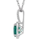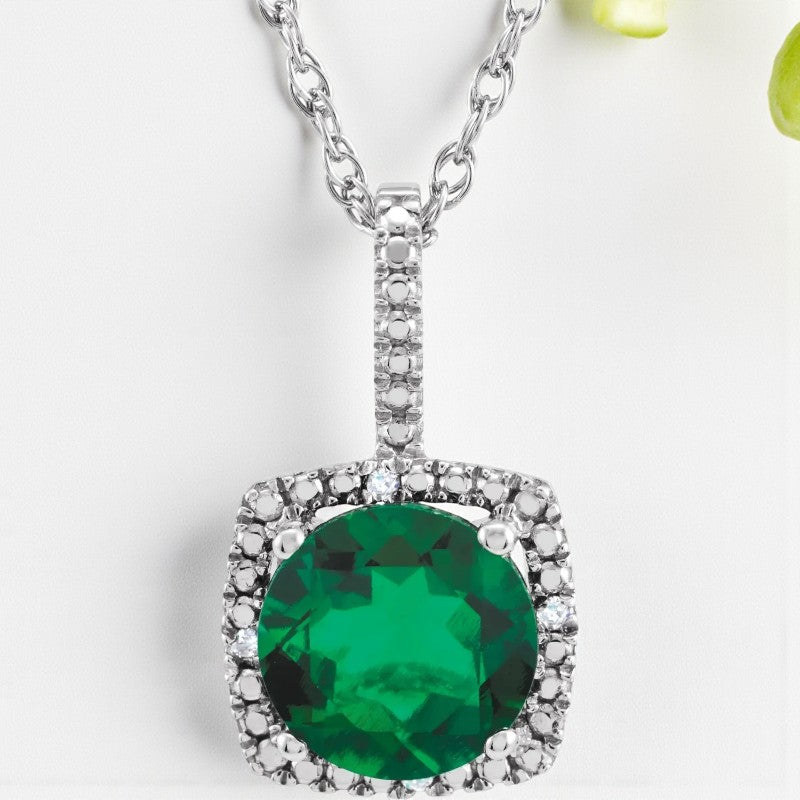 Set on an elegant 18-inch sterling silver chain, this necklace features a 7mm emerald of perfect size and shape, accented by round diamonds totaling 0.015 carats that enhance its radiance with a subtle sparkle. Each gemstone is unique, imbuing the piece with its own distinct beauty—allowing for slight variations in color that add to its individual charm.