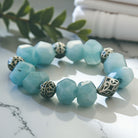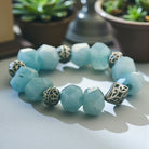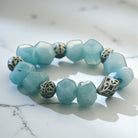 Embrace serenity and clarity with this exquisite aquamarine bracelet, featuring a stunning blend of vibrant aquamarine faceted nugget stones and intricate silver designer bali beads at its core. Nestled near the heart of the bracelet is a simple yet elegant vintage-inspired silver centerpiece, adding a touch of timeless beauty to the design.