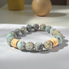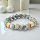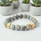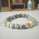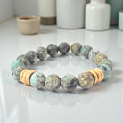 This listing features a 10mm matte African turquoise bracelet adorned with six gold brushed rings. Each purchase includes one bracelet, with an average size of approximately 7" for women and 8” for men. The bracelet is strung on a sturdy clear elastic cord and is complemented by a natural gold Infinite Warrior charm.