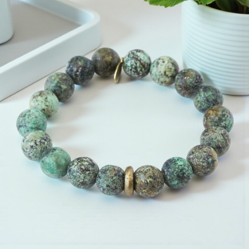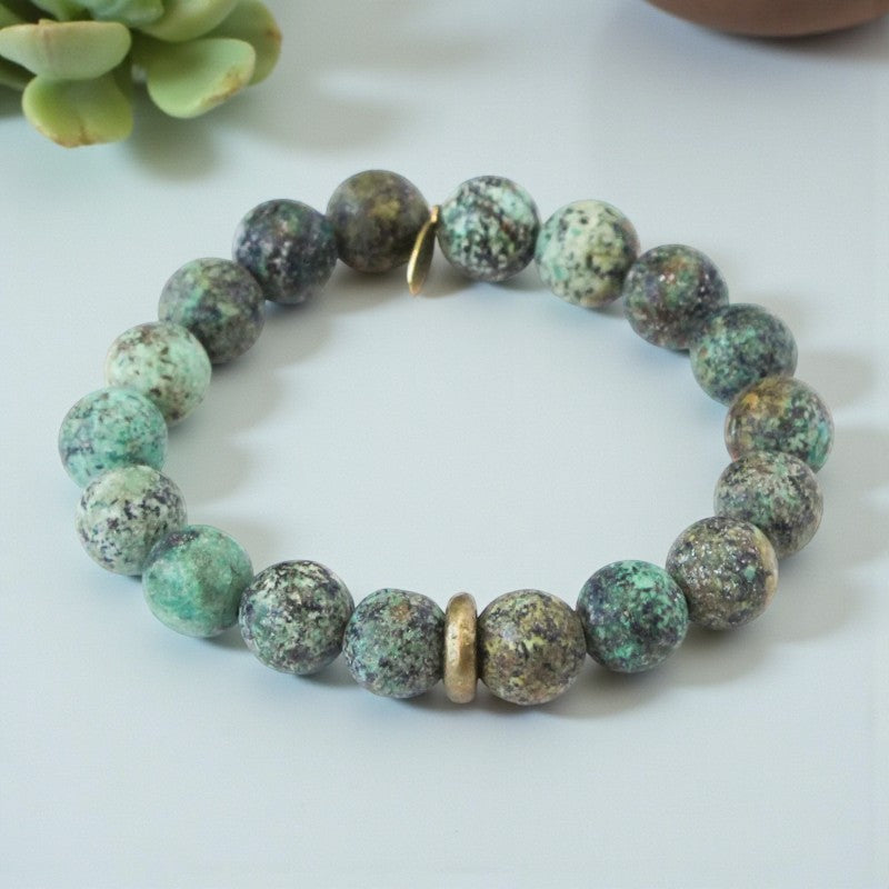 This stunning 10mm matte African turquoise bracelet, accented with a brass ring, is a remarkable piece that resonates with the energies of the heart, throat, and third eye chakras. Crafted to empower and heal, this bracelet is particularly beneficial for individuals born under the zodiac signs Scorpio, Sagittarius, Aquarius, and Pisces, as well as those connected to the December birthstone.