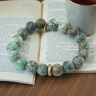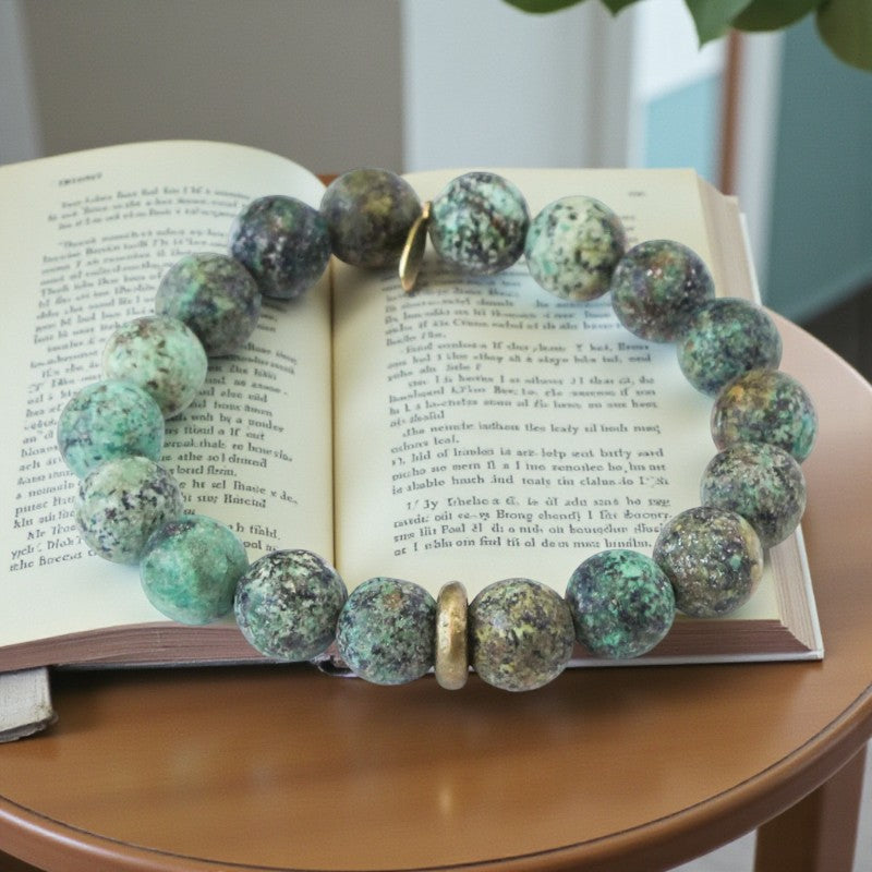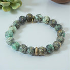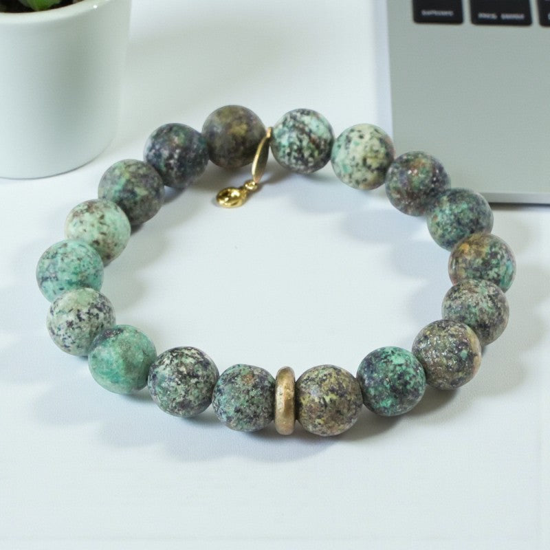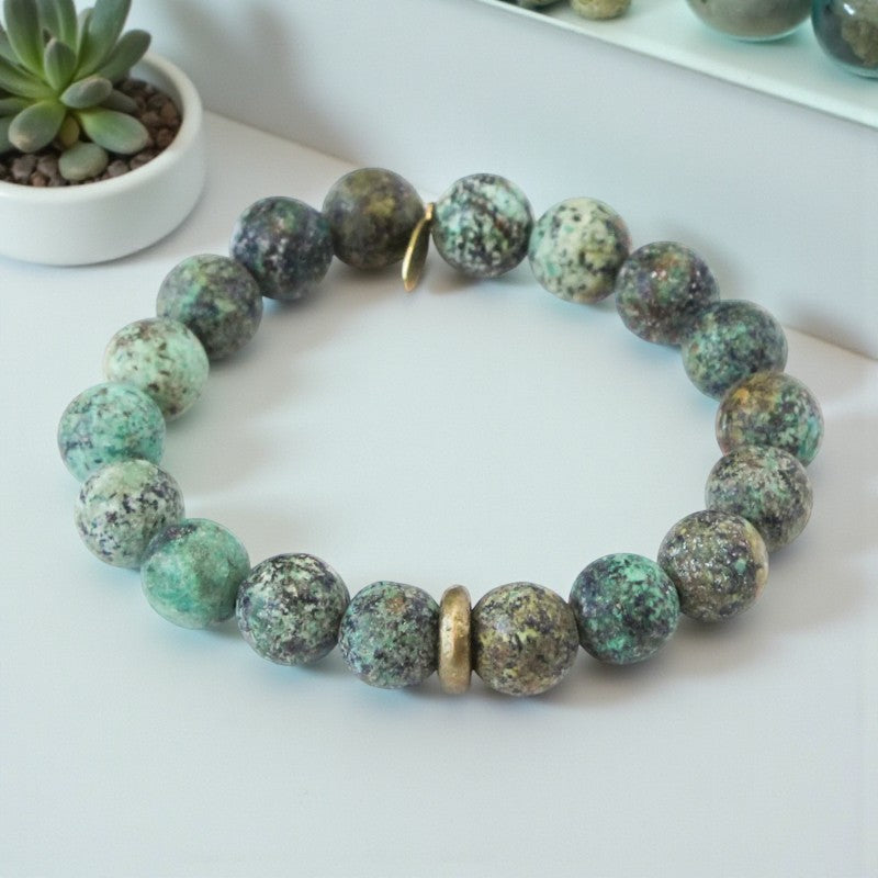 African turquoise is renowned for its ability to prevent panic attacks, reduce anxiety, and boost immunity. It serves as a purification stone, dispelling negative energy and promoting feelings of serenity and balance. The addition of the brass ring adds a touch of elegance and uniqueness to this already powerful bracelet.