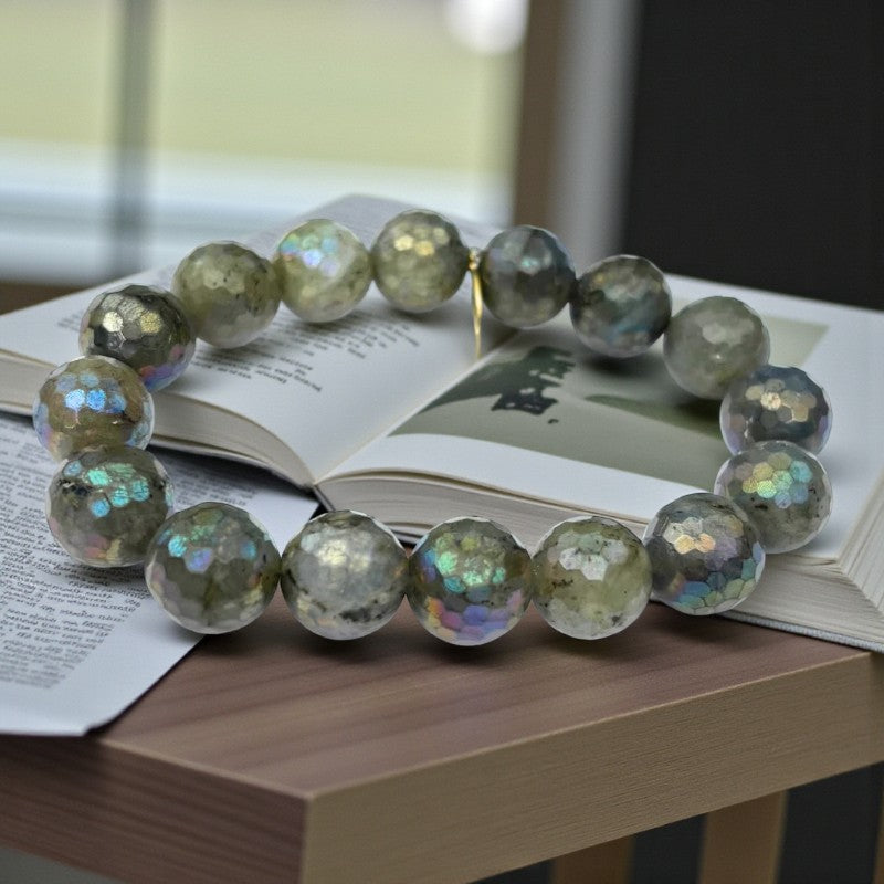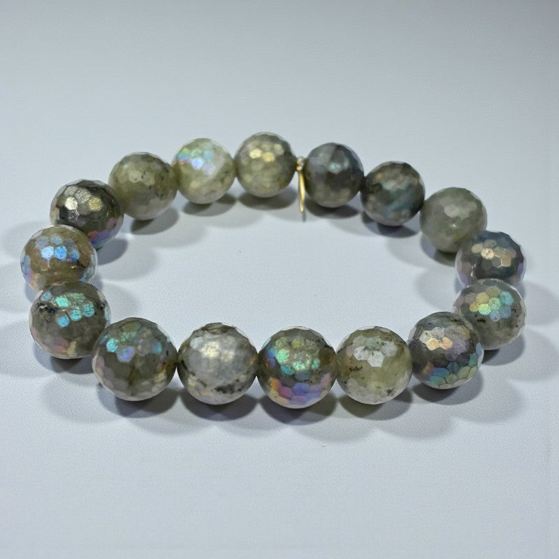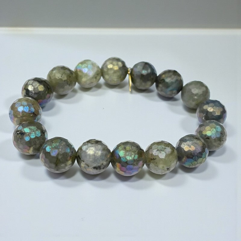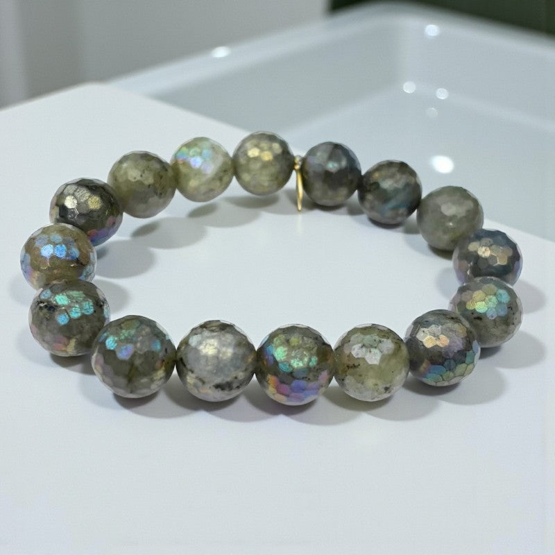 - **Crystal Type:** 12mm faceted Unicorn Labradorite bracelet with a brass ring