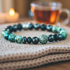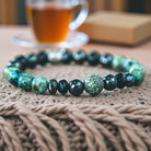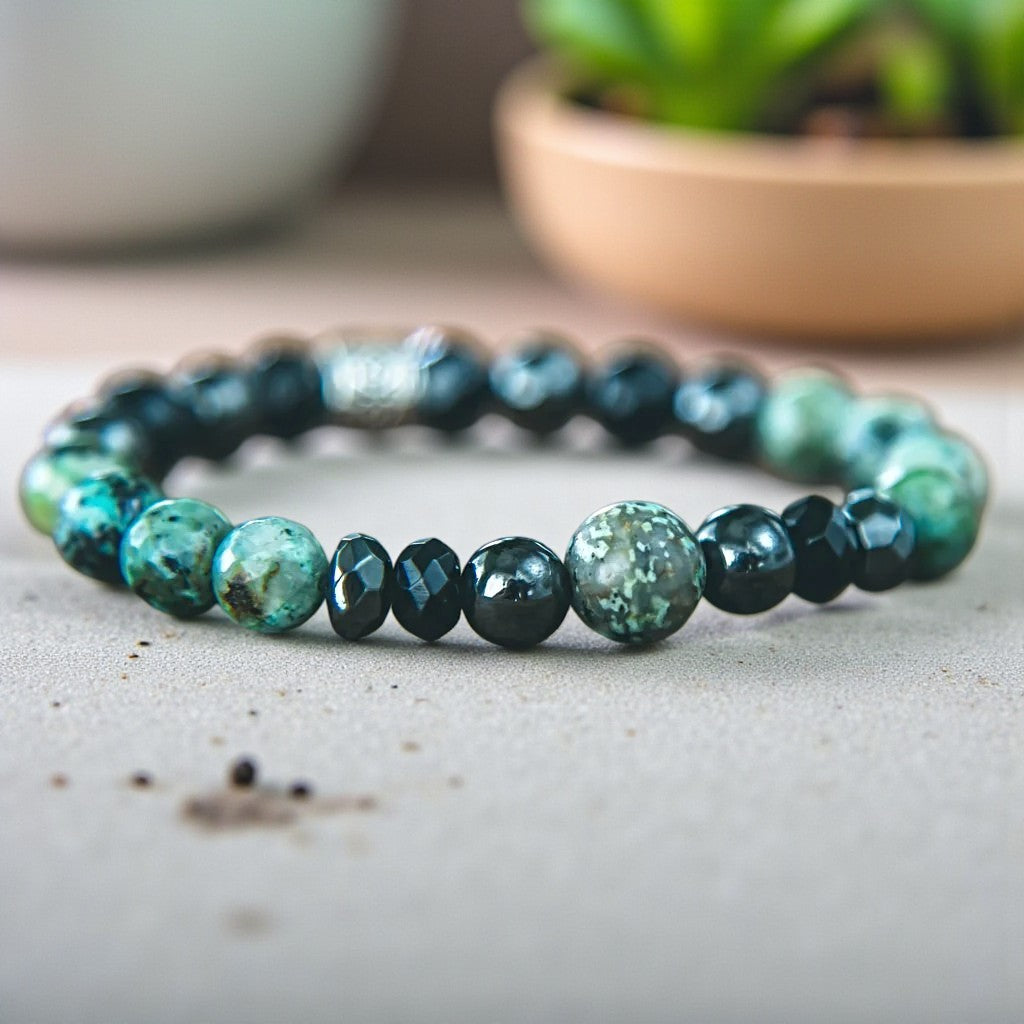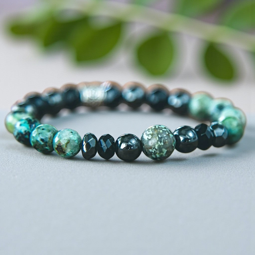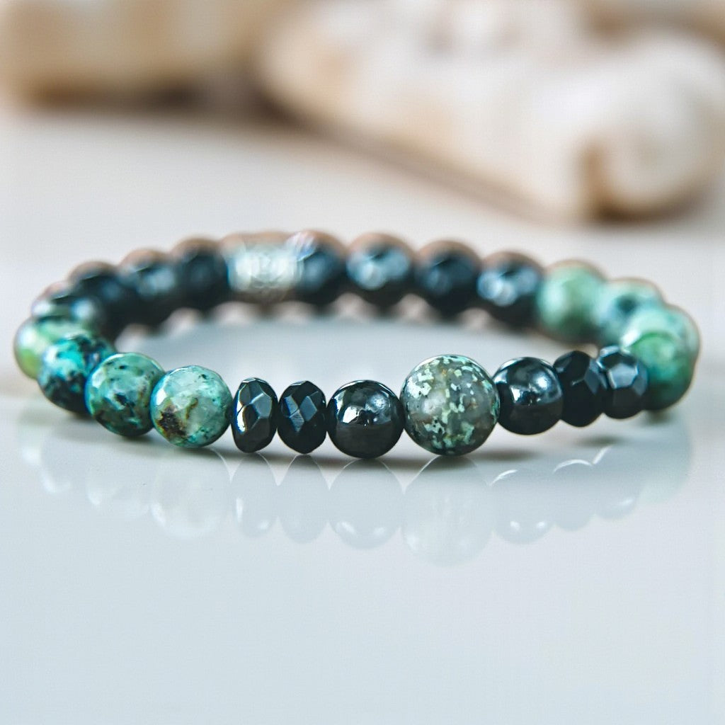 Elevate your style with this striking bracelet that makes a bold fashion statement. African turquoise, black onyx, and hematite intertwine in various styles to craft this exceptional piece. The blend of greenish-blue and beige tones lends a rustic charm to the bracelet, meticulously beaded for a flawless finish. Wear this accessory to exude style, confidence, and a sense of control, while benefiting from the protective and transformative energies of these rare gemstones.