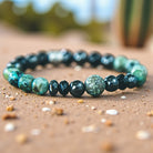 At the heart of this exclusive bracelet lies a substantial piece of African turquoise, symbolizing balance, prosperity, and purpose. The smooth, rounded African turquoise beads scattered throughout the design ensure you harness the full potential of this remarkable stone. African turquoise guides you towards finding your true calling and leaves a positive impact on those around you.