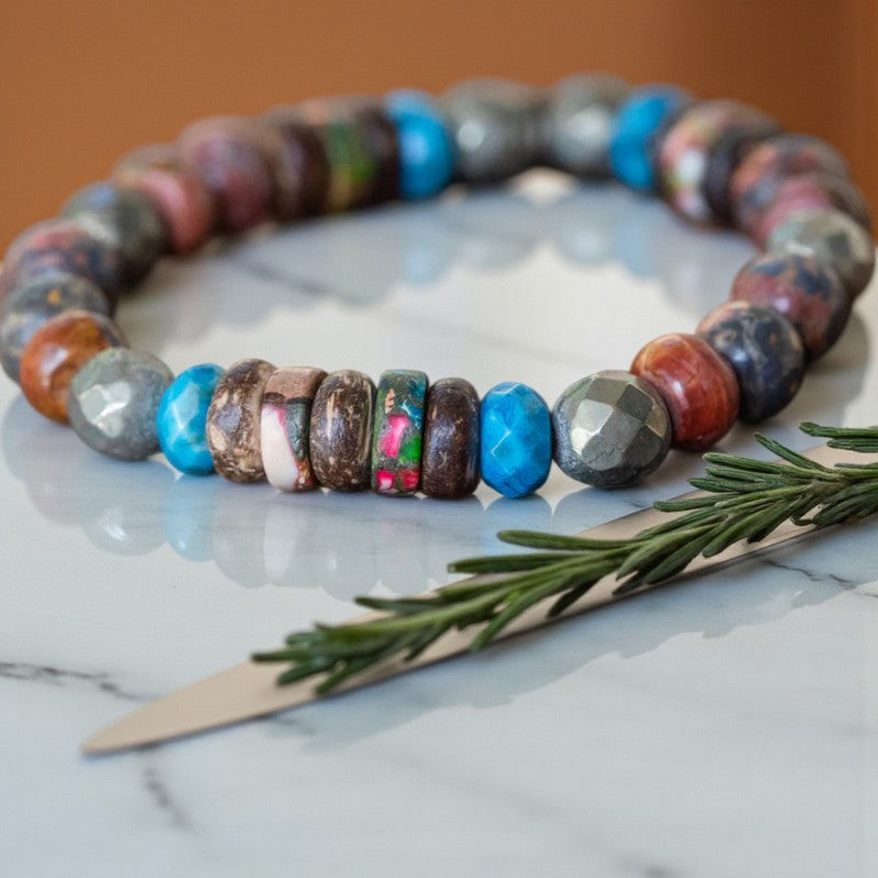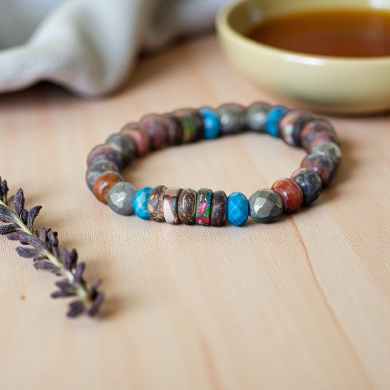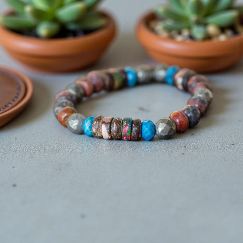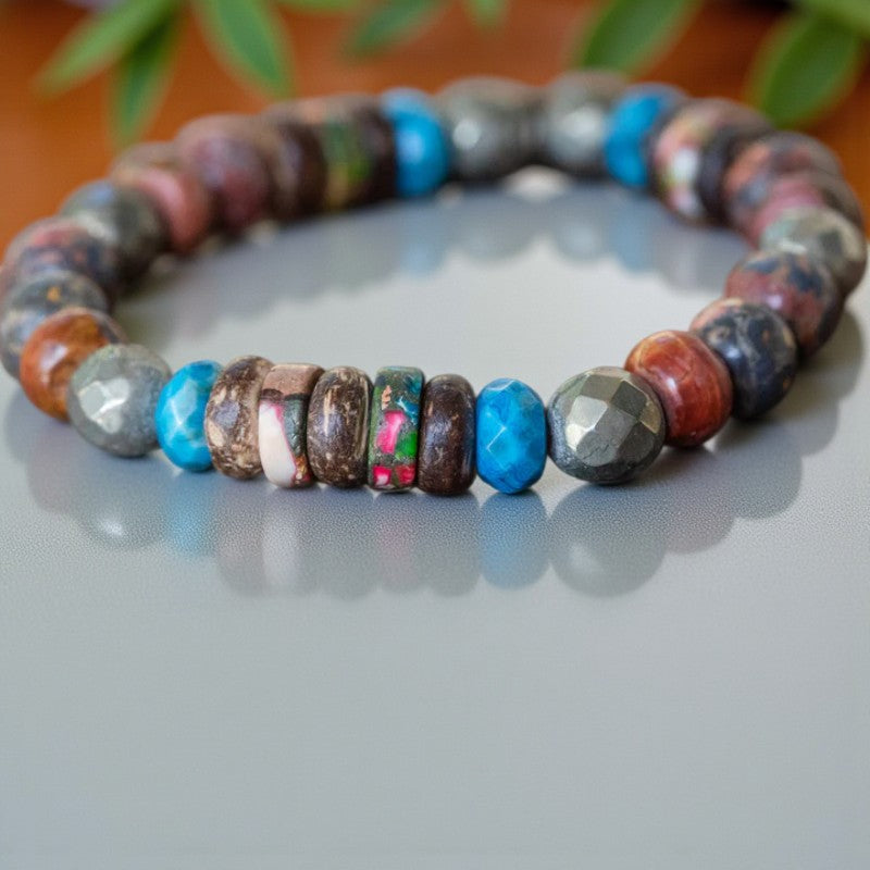 This versatile unisex stackable stretch bracelet boasts a harmonious fusion of natural gemstones, including Impression Jasper, Pyrite, Red Creek Jasper, Buri Wood, Crazy Lace Agate, and Sesame Jasper, each imbued with unique healing qualities and exquisite beauty.