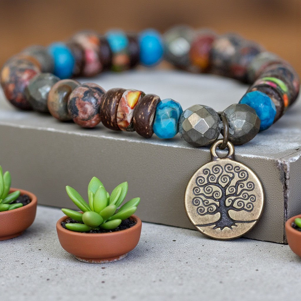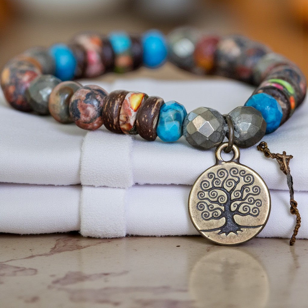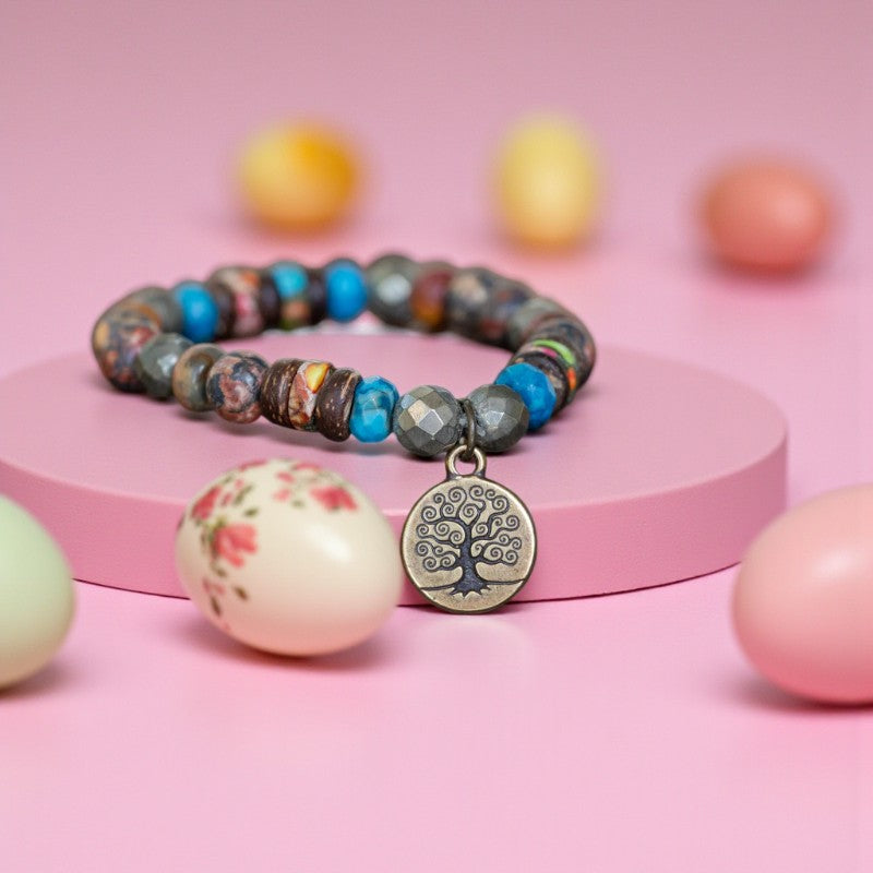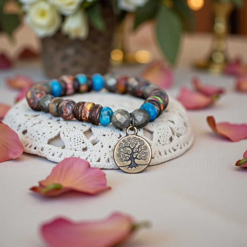 Enhancing the bracelet's allure is a brass charm featuring the Tree of Life, symbolizing the eternal continuity embodied within this exquisite piece.