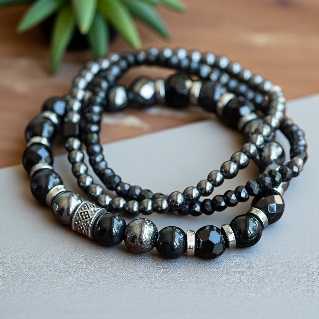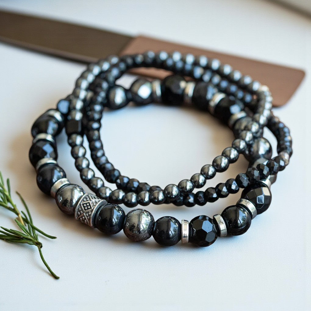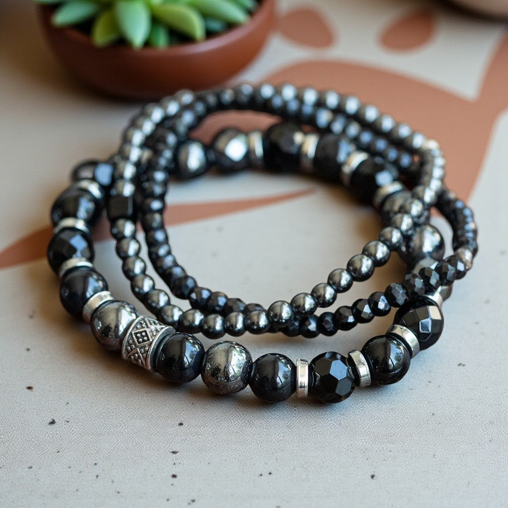 Vitality Guardian: Hematite, Black Spinel, and Onyx Bracelet Trio