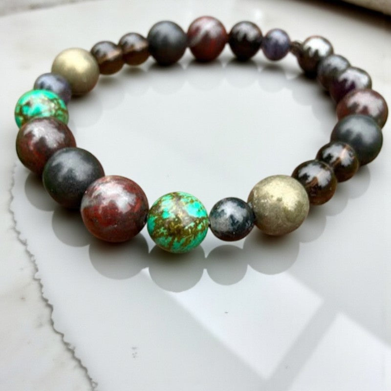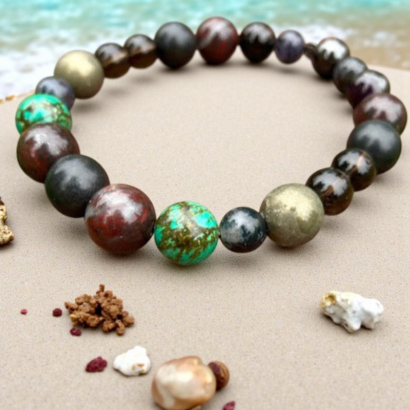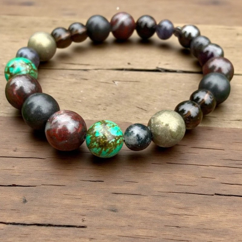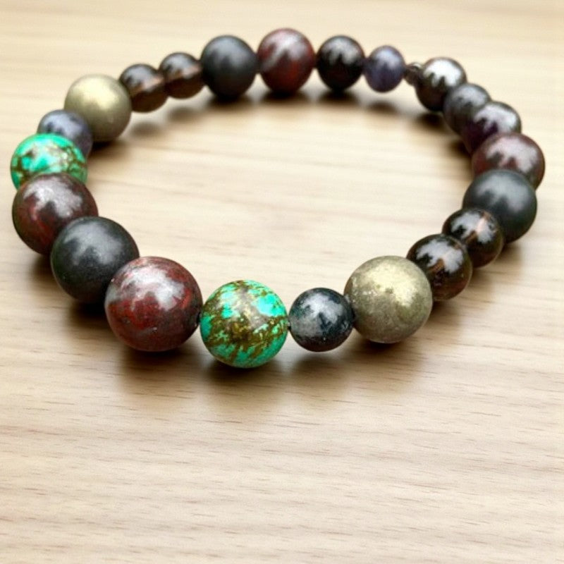 Seeking a source of life force for healing and protection? Look no further than this men's gemstone stacking bracelet, brimming with potent energies to bolster your well-being while exuding a ruggedly refined charm.