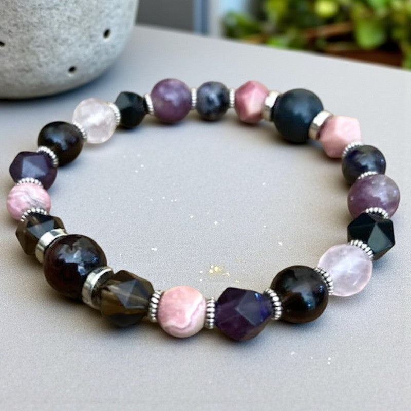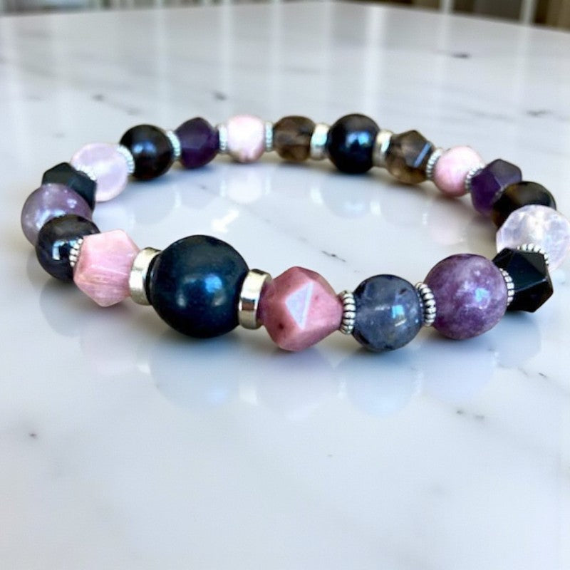Step into a world of profound healing and protection with our Master Healer Bracelet, a masterpiece crafted to elevate your energy and nurture your soul. This extraordinary bracelet is a harmonious blend of Shungite, Rhodonite, Petalite, Smoky Quartz, Sugilite, Iolite, Rose Quartz, Amethyst, and exquisite silver accent beads—a symphony of healing energies designed to bring comfort, balance, and transformation.