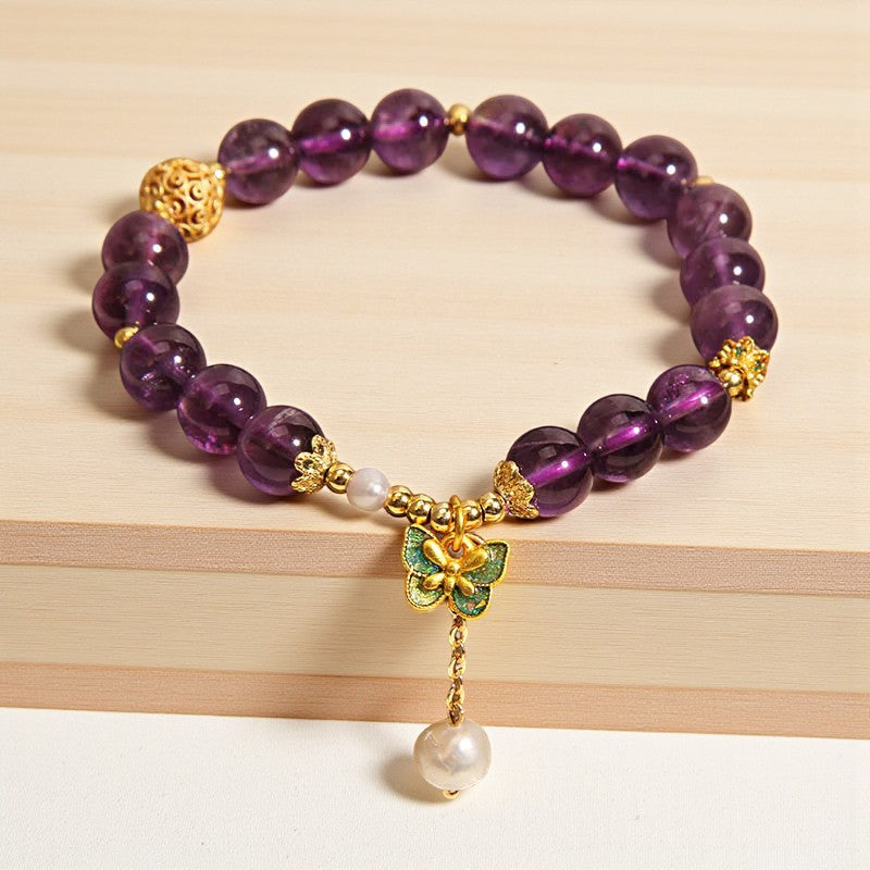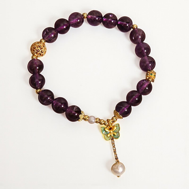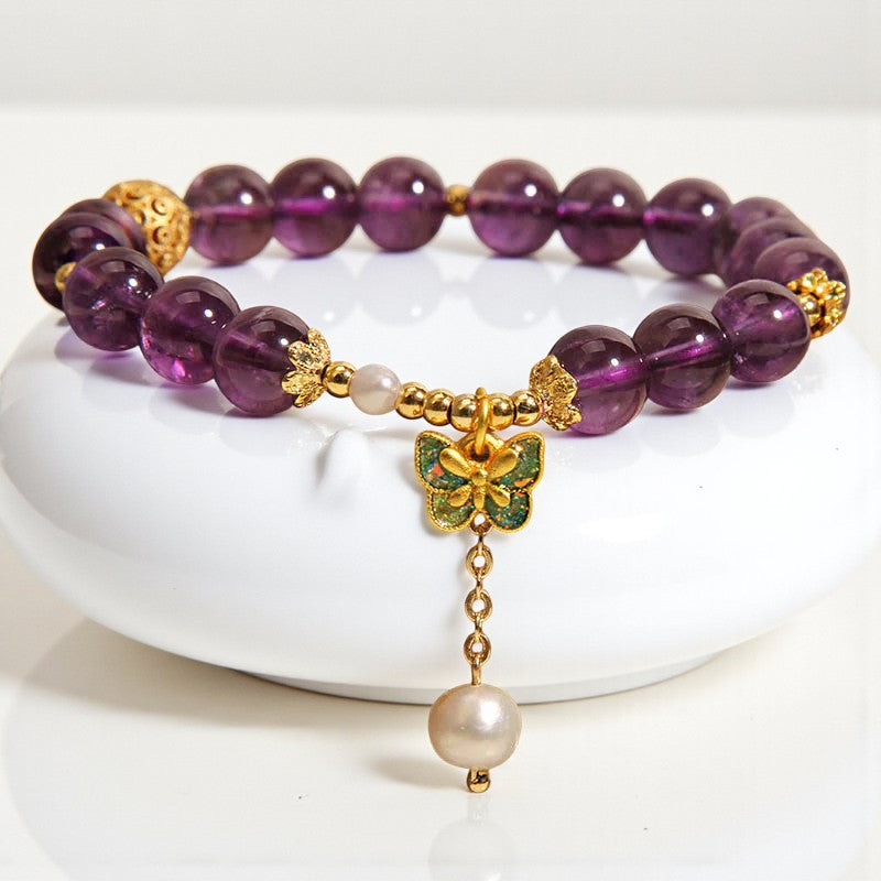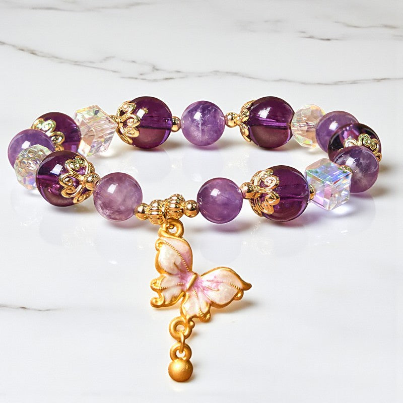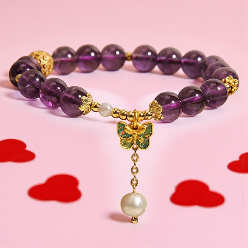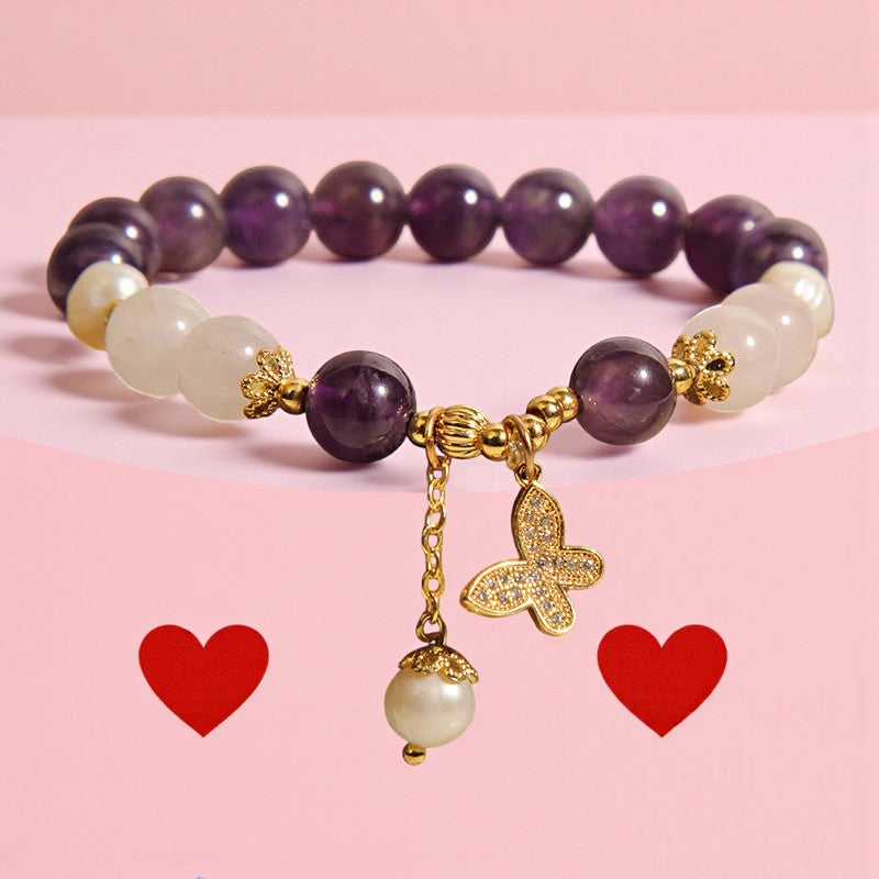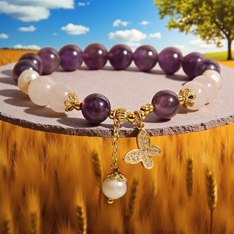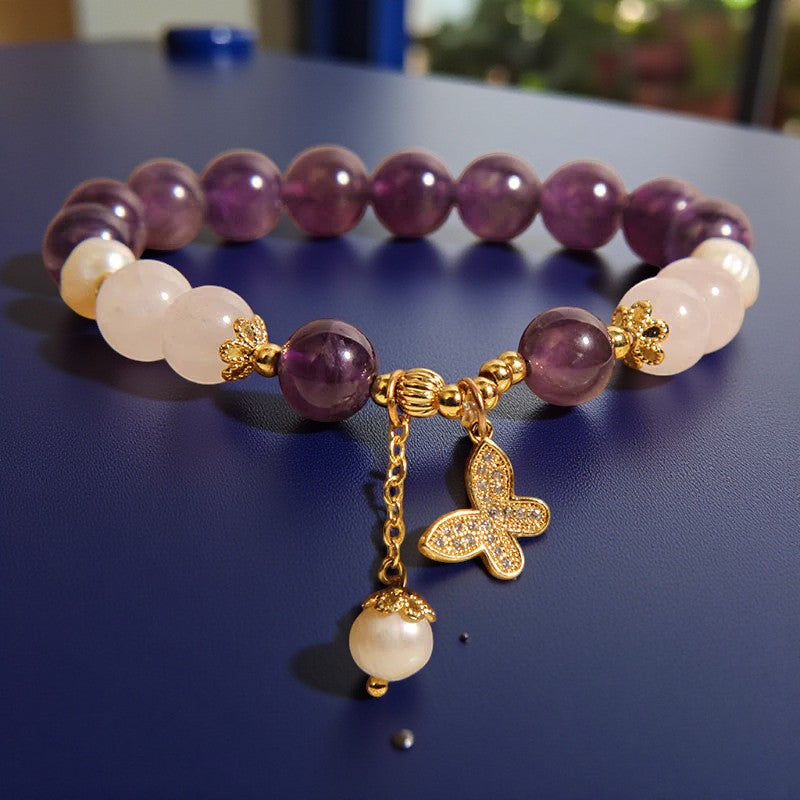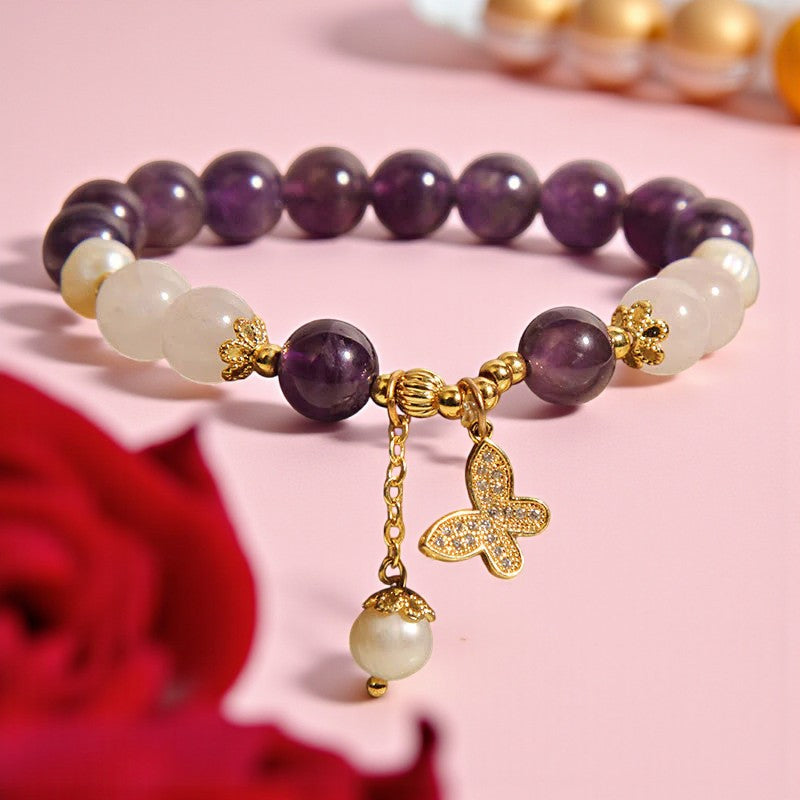 Spiritual Healing Amethyst Pearl Crystal Butterfly Charm Bracelet