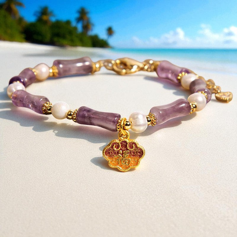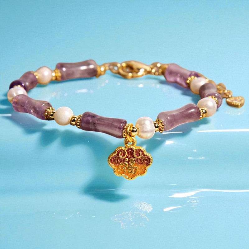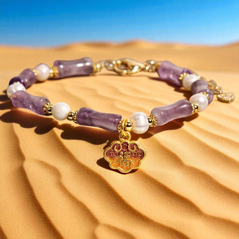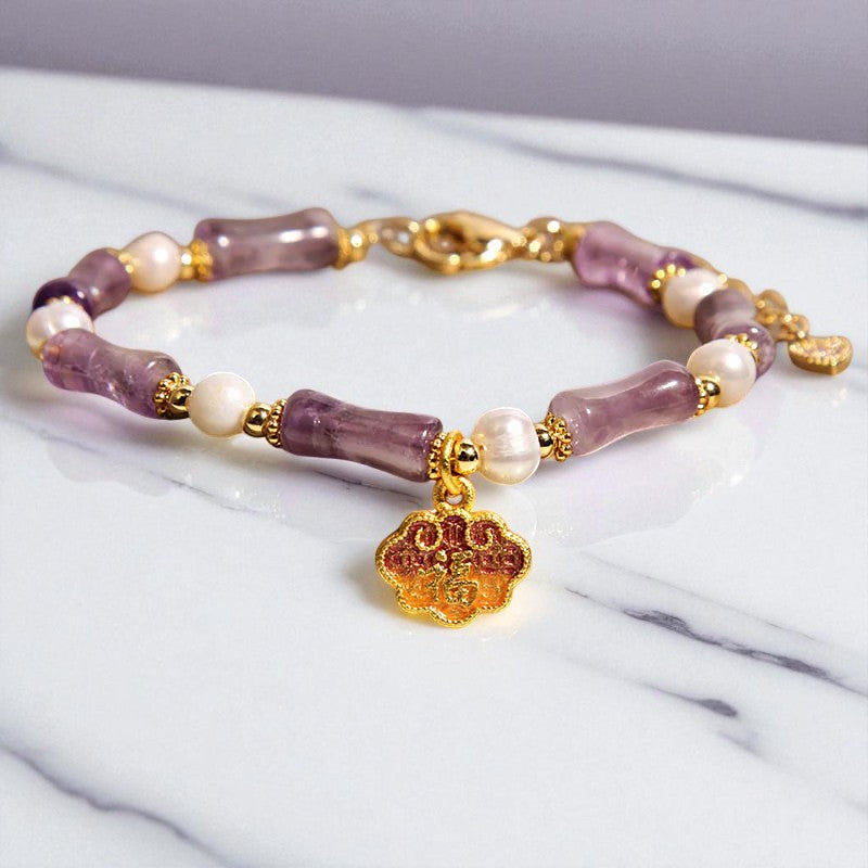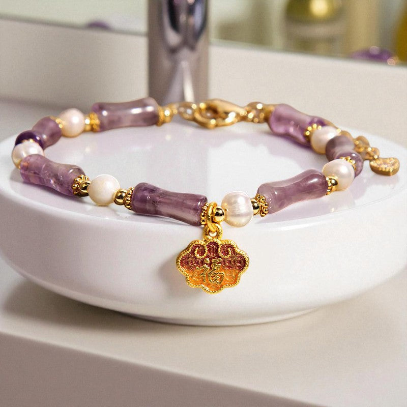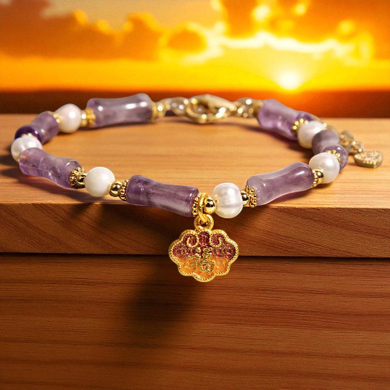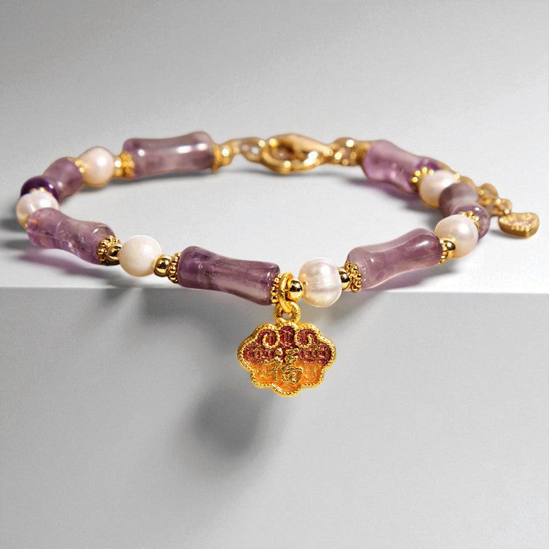 Natural Amethyst Pearl-Inlaid Peace Lock Bamboo Shape Fu Character Balance Bracelet