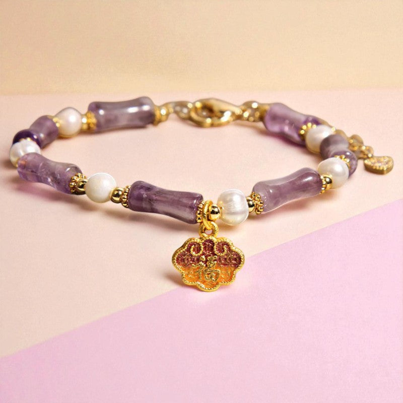 Natural Peace Lock Bamboo Shape Fu Character Amethyst Pearl Balance Bracelet