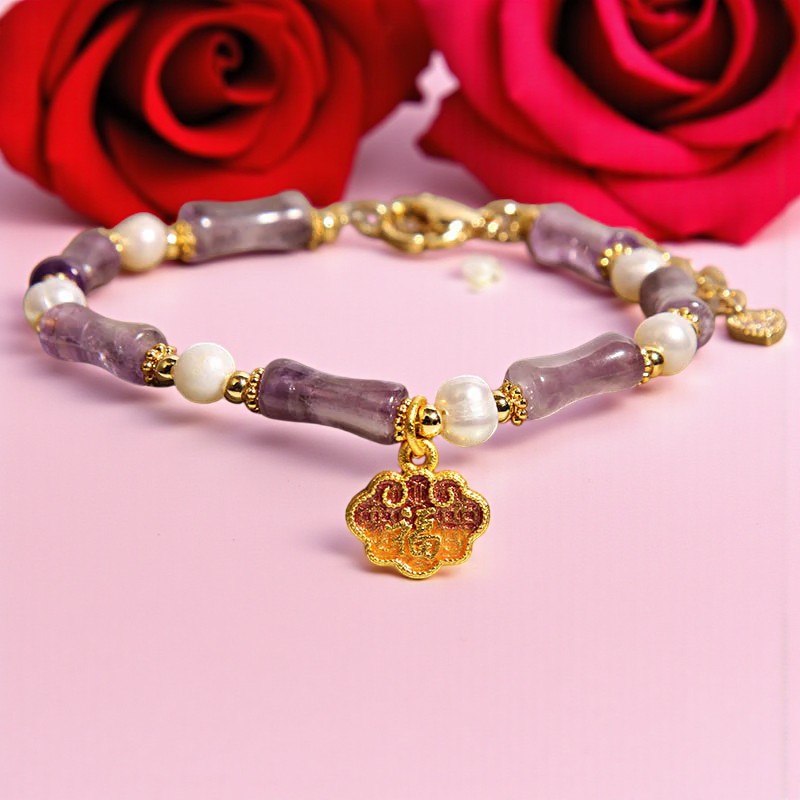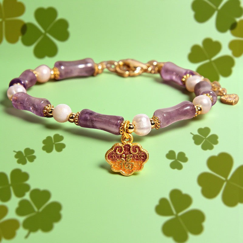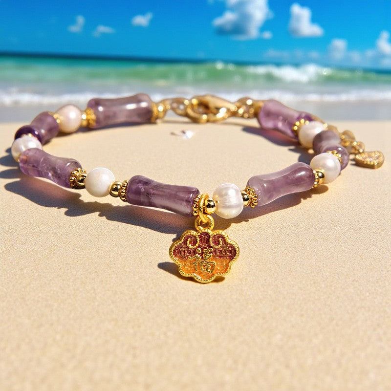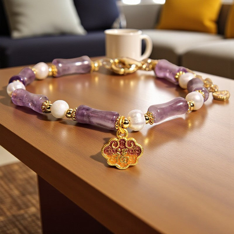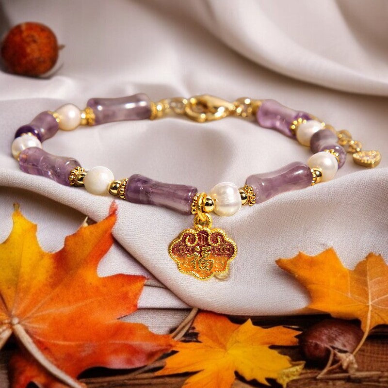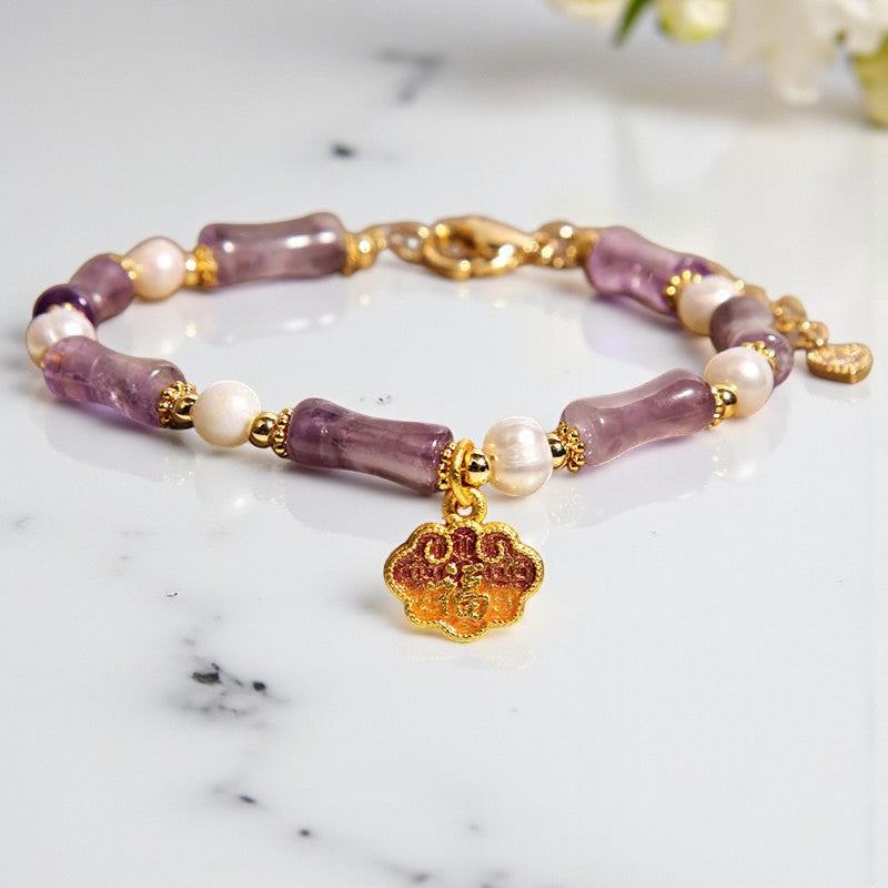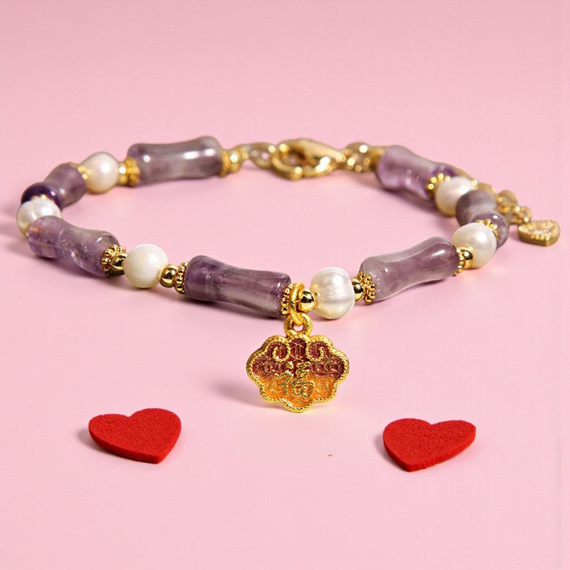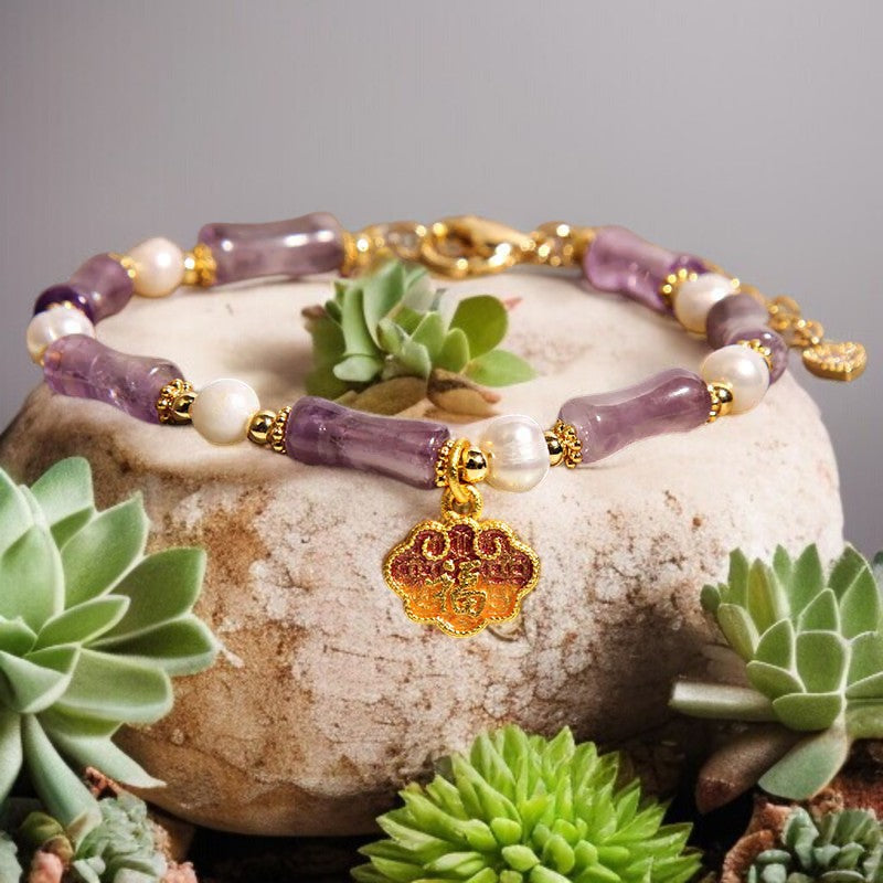 Natural Amethyst Pearl-Inlaid Peace Lock Bamboo Shape Fu Character Balance Bracelet