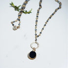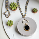 More than a mere adornment, this exquisite necklace transcends the realm of accessories to become a potent piece of wearable art that speaks directly to the soul. At its core gleams a resplendent oval black onyx center stone, embraced by a luminous gold bezel. This commanding centerpiece connects to a textured 14K gold circle, symbolizing unity, fortification, and resilience. The chain of the necklace, meticulously crafted, features glistening faceted black pyrite stones, each delicately wrapped in gold wire, creating a mesmerizing interplay of light and shadow that captures attention from every vantage point.