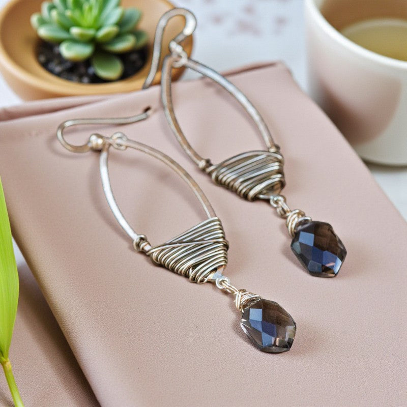 At the core of each earring dangles a faceted hexagonal smoky quartz crystal, delicately ensconced within a golden embrace. The crystal's brilliance is accentuated by the lustrous gold-filled wire, enhancing its inherent grounding energy. The geometric allure of the smoky quartz introduces a touch of modern refinement, complementing the intricate metalwork with its earthy hues.