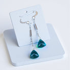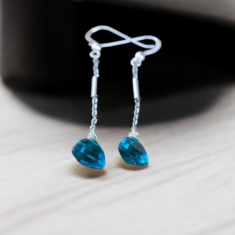 Crafted with precision and care, these exquisite earrings embody a harmonious blend of sophistication and adaptability, showcasing a faceted trillion-cut peacock blue quartz crystal as the focal point. Encased in sterling silver wire with meticulous craftsmanship, the stone is artfully presented to radiate its resplendent brilliance from every perspective. The deep, opulent tones of the peacock blue quartz are enchanting, exhibiting a spectrum of vibrant blues that shimmer and play with the light. The facets of the crystal capture attention, bestowing a luminous sparkle that imparts a touch of opulence to these earrings.